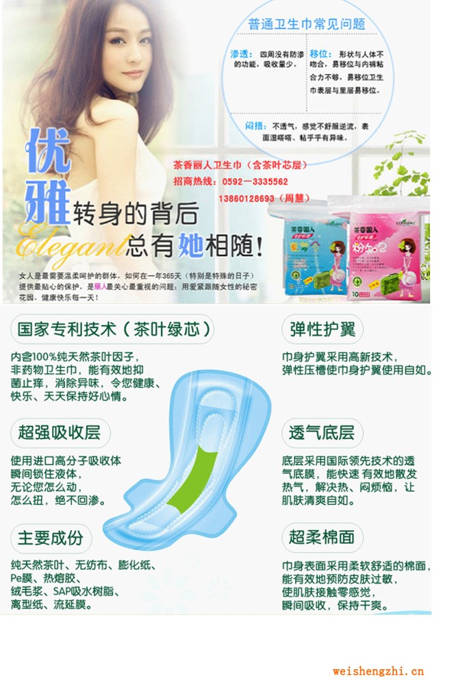 活性茶因子衛生巾及護墊是高級的衛生用品,能預防各種婦科炎癥、消除異味,使用安全可靠無副作用,不屬于藥物類 產品,不添加任何藥物成分,是純天然的茶葉綠芯原料。